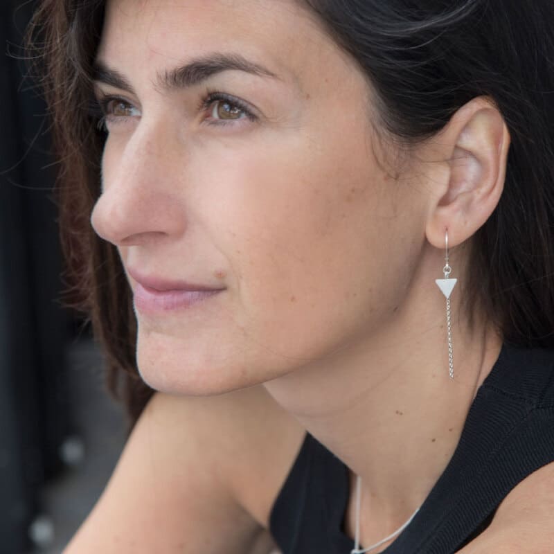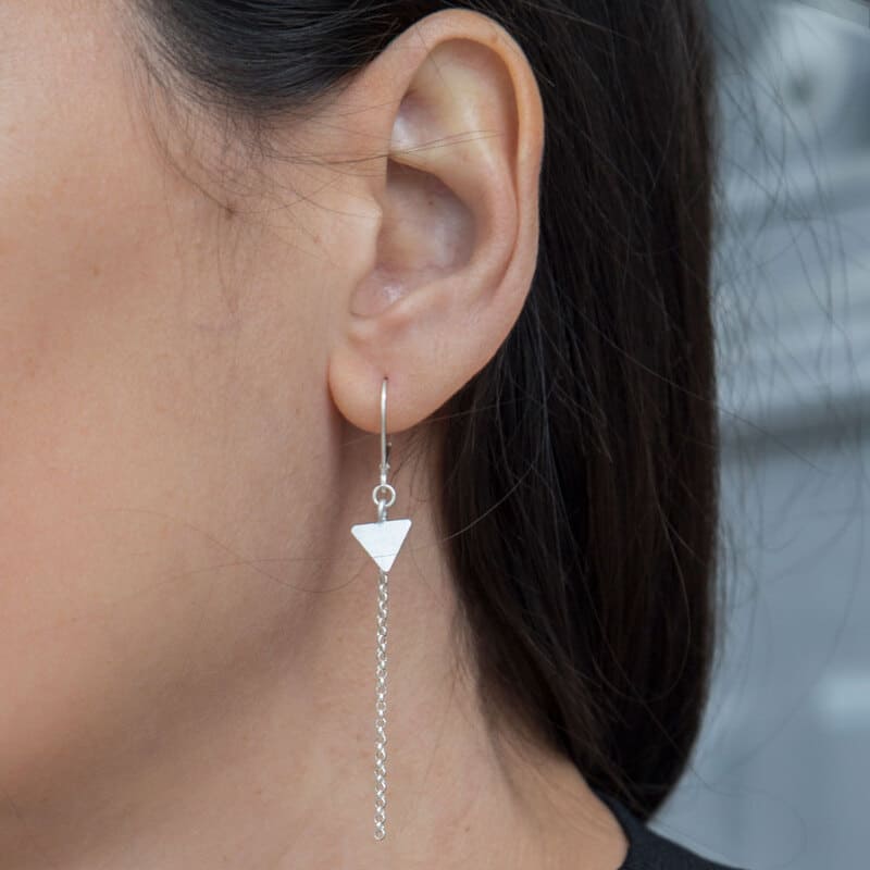 These original silver triangles are the perfect combination of edgy and elegant! The long dangling chain gives the earring nice movement and a modern look. The perfect look for a day at the office or a night on the town, these earrings make a great accessory to your everyday style!