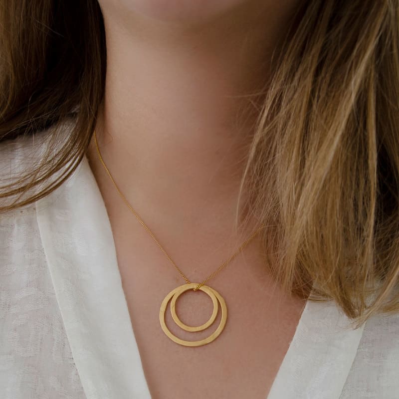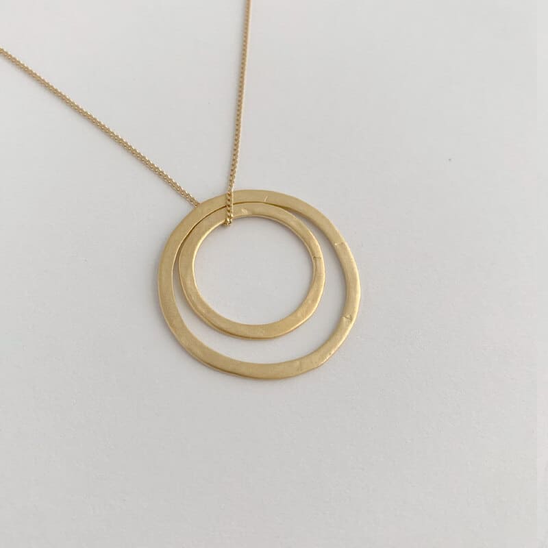 Composed of two hammered circles of different sizes, this beautiful gold necklace is versatile as you can wear it with as it is or you can take off one of the circles. Don’t you love it?