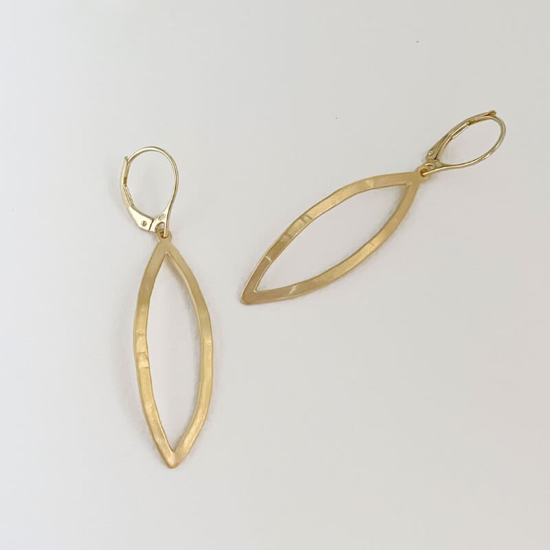 These gold leaf shaped earrings have a beautiful swing while wearing them. Original hammered earrings, they will be one of your favorite earrings.