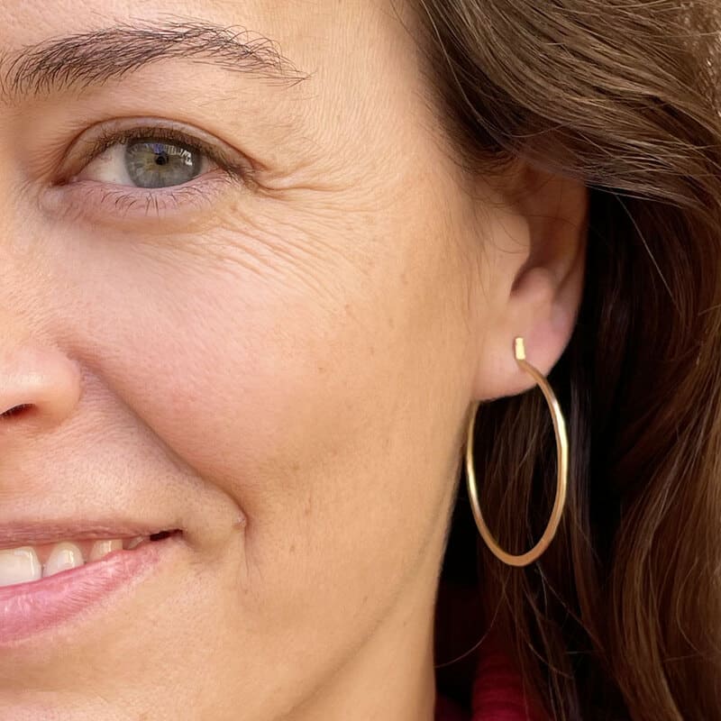 These simple hammered gold hoop earrings are made one by one making each piece unique. Perfect Hoop Earrings if you have a ripped ear hole because they hide it. A must-have in your jewelry box if you are a Hoop Lover.