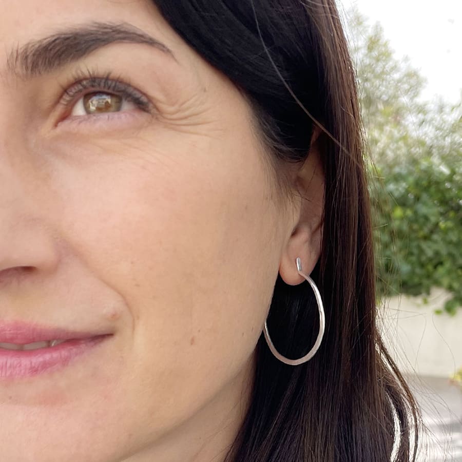 These simple hammered hoop earrings are made one by one making each piece unique. Perfect Hoop Earrings if you have a ripped ear hole because they hide it. A must-have in your jewelry box if you are a Hoop Lover.