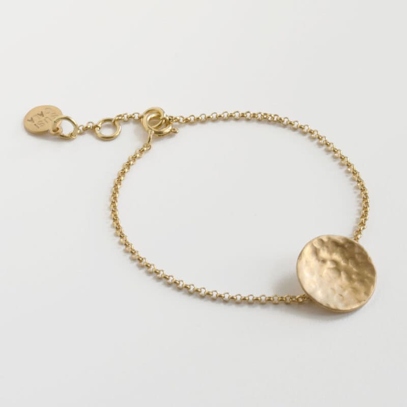 This gold chain bracelet with hammered texture simulating the full moon, is adjustable and comfortable. You can combine it with other Susi Cala’s bracelets or just wear it by itself. Let yourself be influenced by the moon by wearing the Moon Bracelet!