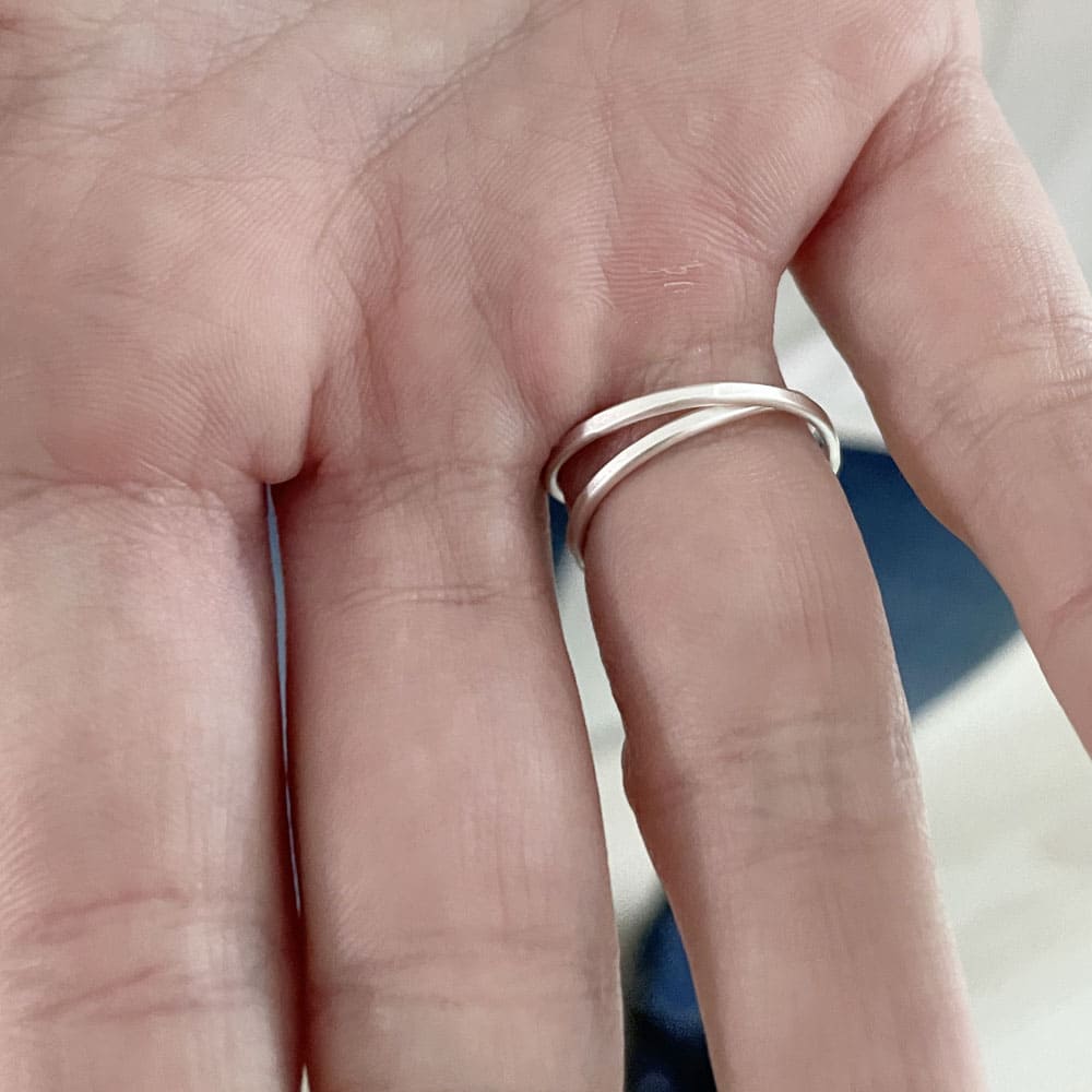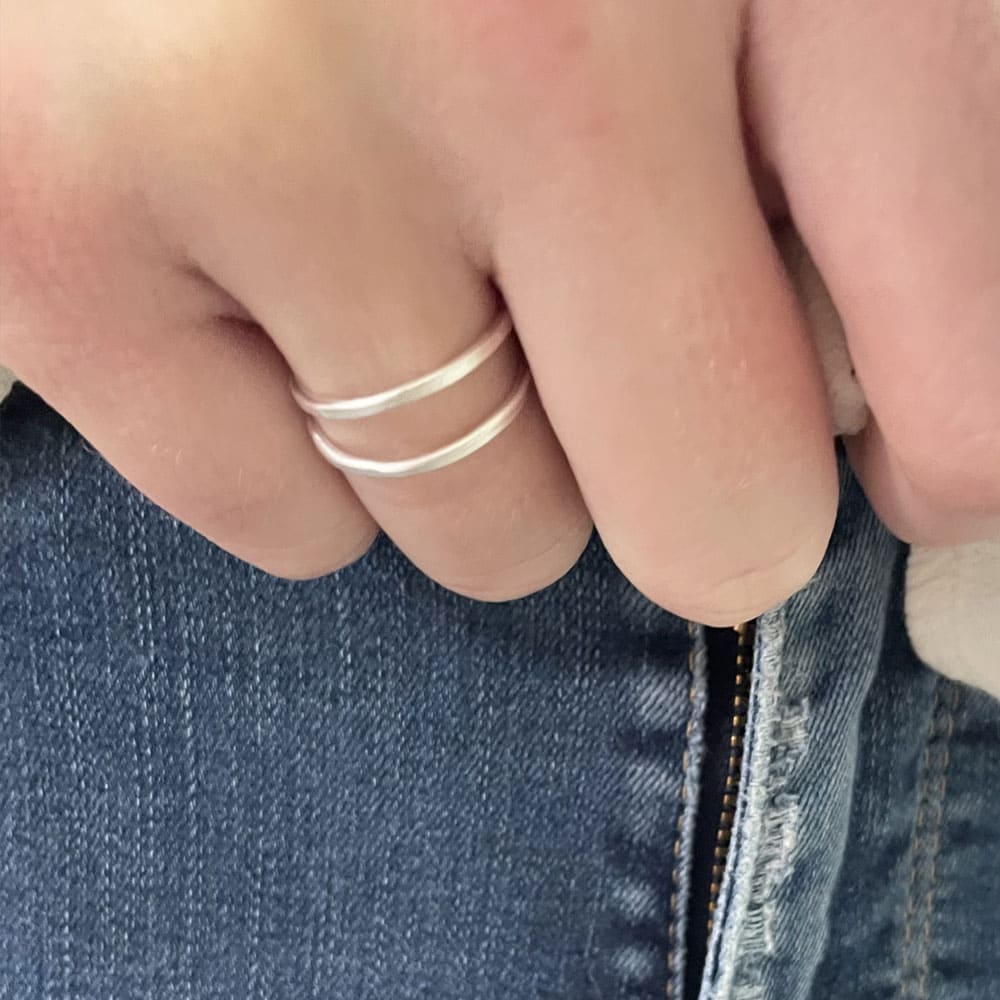 This sterling silver ring features a subtle double-band design with a clean, hand-hammered finish. Made one by one, it’s a minimalist stacking piece that works just as well on its own.