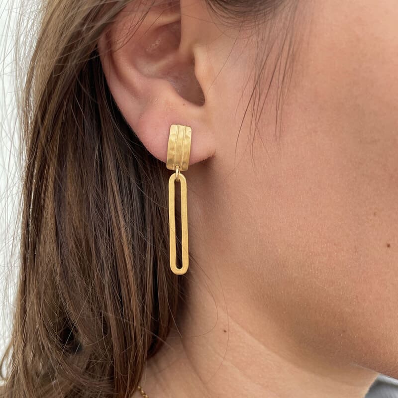 These dangling rock-style earrings are very comfortable and they have a beautiful balance. If you have a ripped ear hole, these earrings are perfect because they hide it.