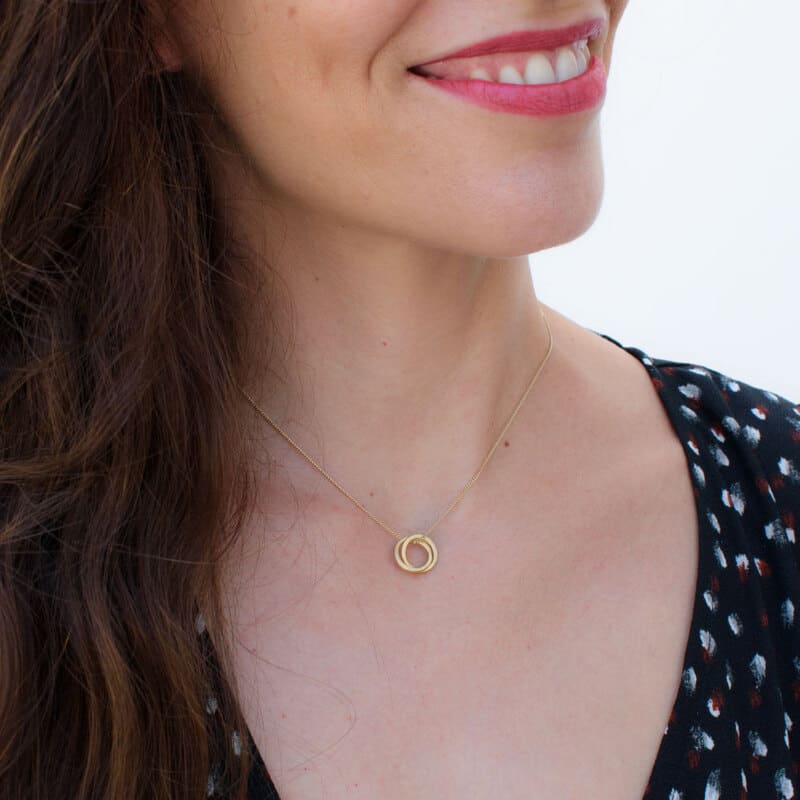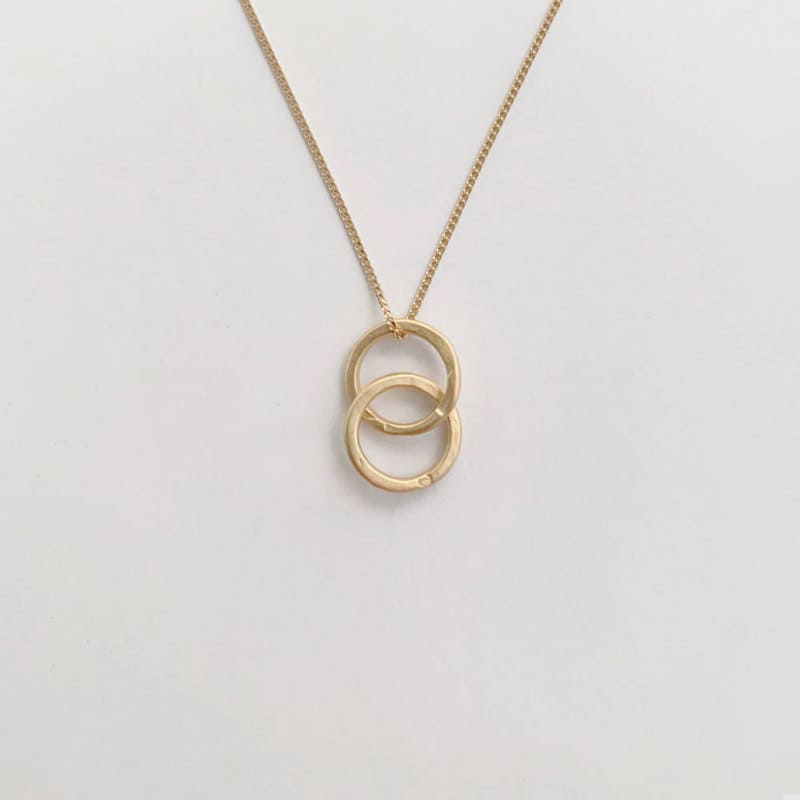 You can play with this versatile double circle gold necklace, as you can wear it in two different positions. Each piece is handmade with a hammer, which makes it unique.
